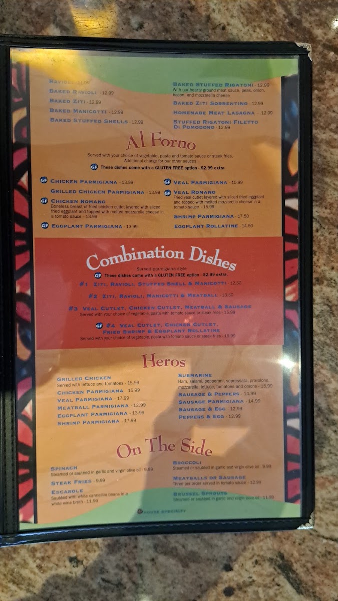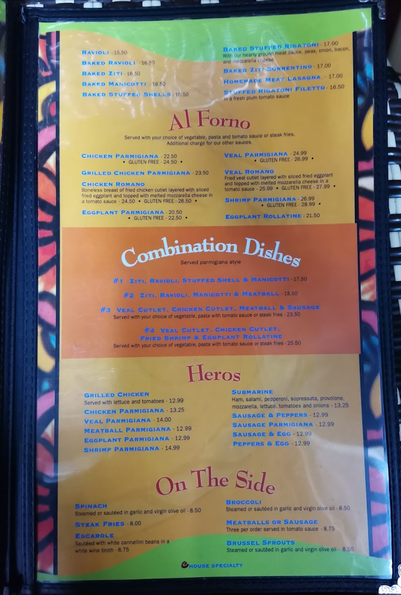 Pasta offerings are diverse, ranging from baked dishes such as Baked Ravioli, Baked Ziti, and Baked Manicotti, to freshly prepared plates including Linguine Pescatore and Penne Ala Vodka. The Al Forno section includes items like Chicken Parmigiana, Grilled Chicken Parmigiana, Chicken Romano, and Eggplant Parmigiana, providing a selection of baked and grilled entrees.